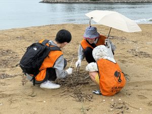 砂浜にしゃがみこんで、小さなプラスチック片を地道に探してもらいました。