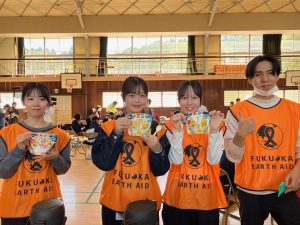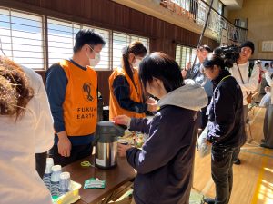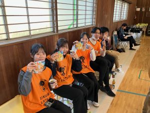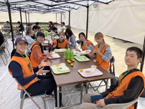 学生ボランティアも配膳に協力し、あたたかいカレーをいただきました。
