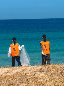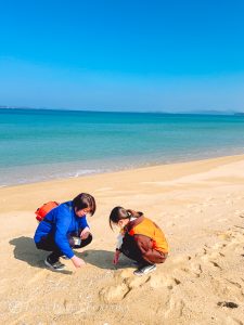 先ほどは歩きながらごみ拾いをしましたが、今度は砂浜にしゃがみこんでの作業。